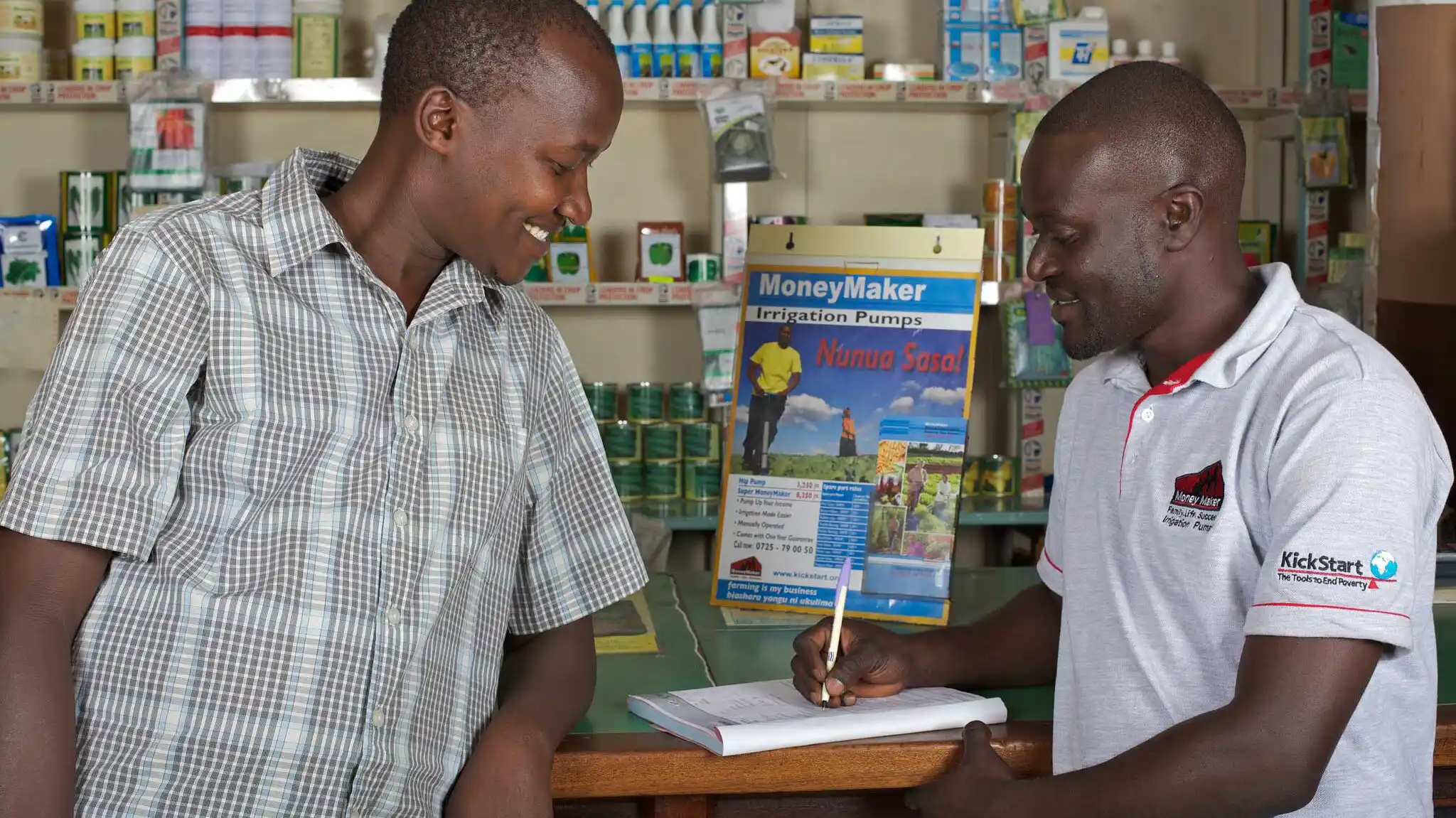 KickStart distributes and sells our irrigation products through independent private sector retailers to sustainably reach as many farmers as possible, where they are. By working with and through local system stakeholders, we never compete with the existing market players. Instead, we leverage the durability and reach of this important supply chain. We uplift these important small and medium-sized businesses with new skills, new customers, and the profits from selling pumps, accessories and the additional inputs that irrigating farmers buy. KickStart’s teams recruit, support, and strengthen the commercial value chains of local distributors that import pumps and accessories, distribute them to networks of local retail outlets and agro-dealers, providing easy access for farmers in their communities. KickStart’s teams outfit these retailers with MoneyMaker branded marketing collateral, train their staff on irrigation and our pumps, monitor their stocks, and provide post-sales support to pump buyers.